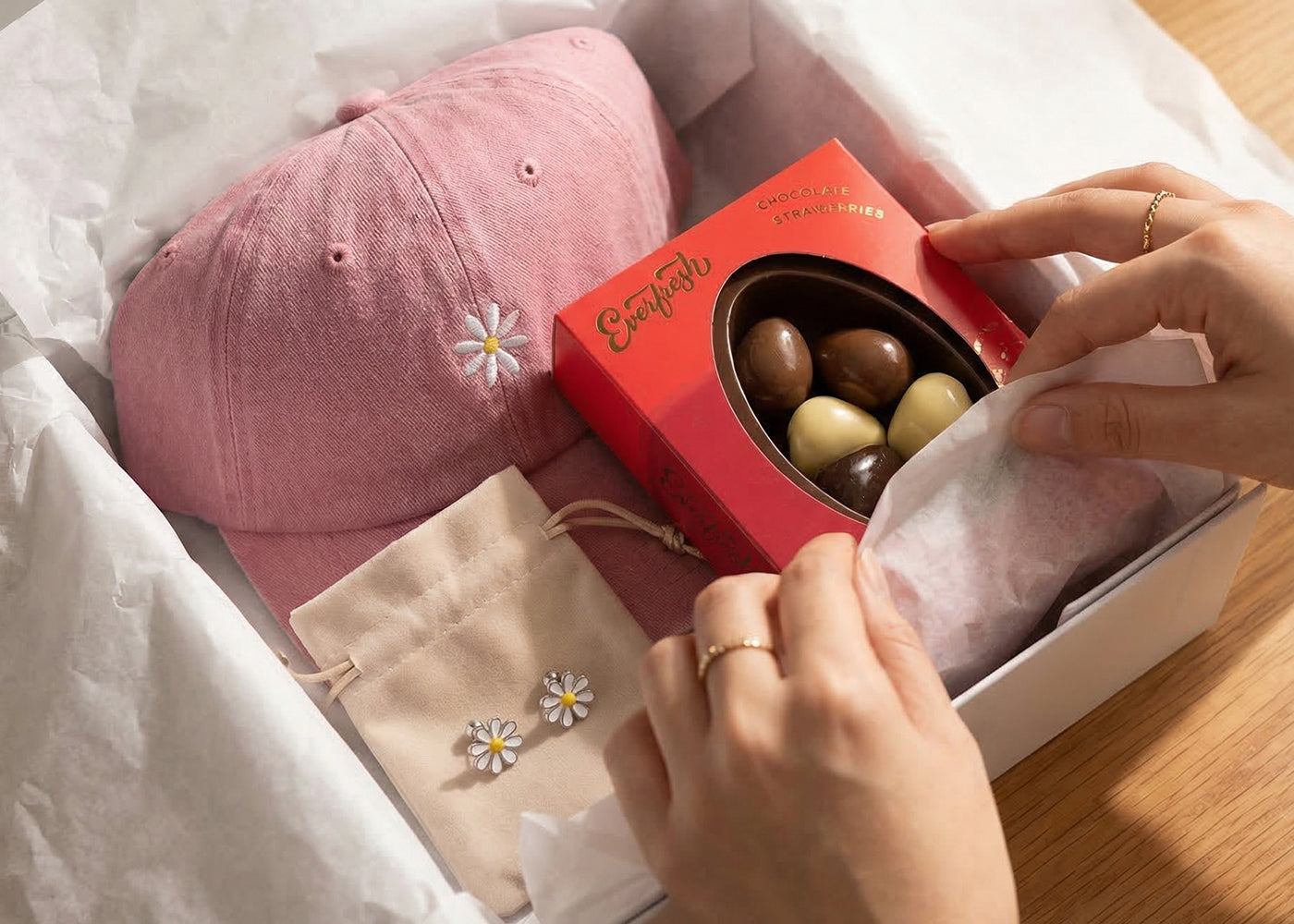 Curated gift boxes with flowers, chocolate, and a little something extra.