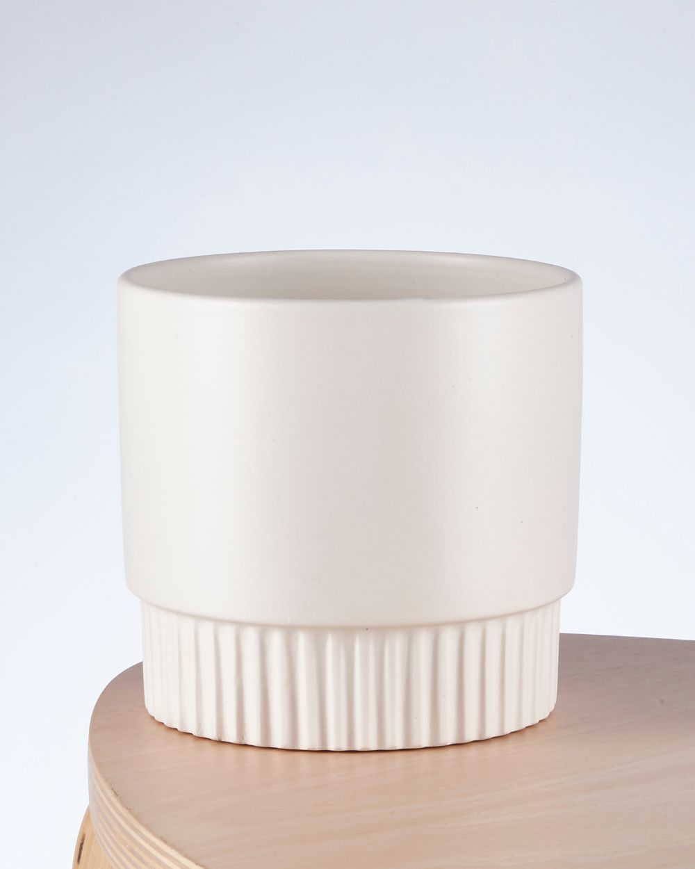 This white ceramic pot features a minimalist design with a ribbed base, adding a subtle texture for modern elegance. Perfect for showcasing your favorite plants or as a chic decor piece.
