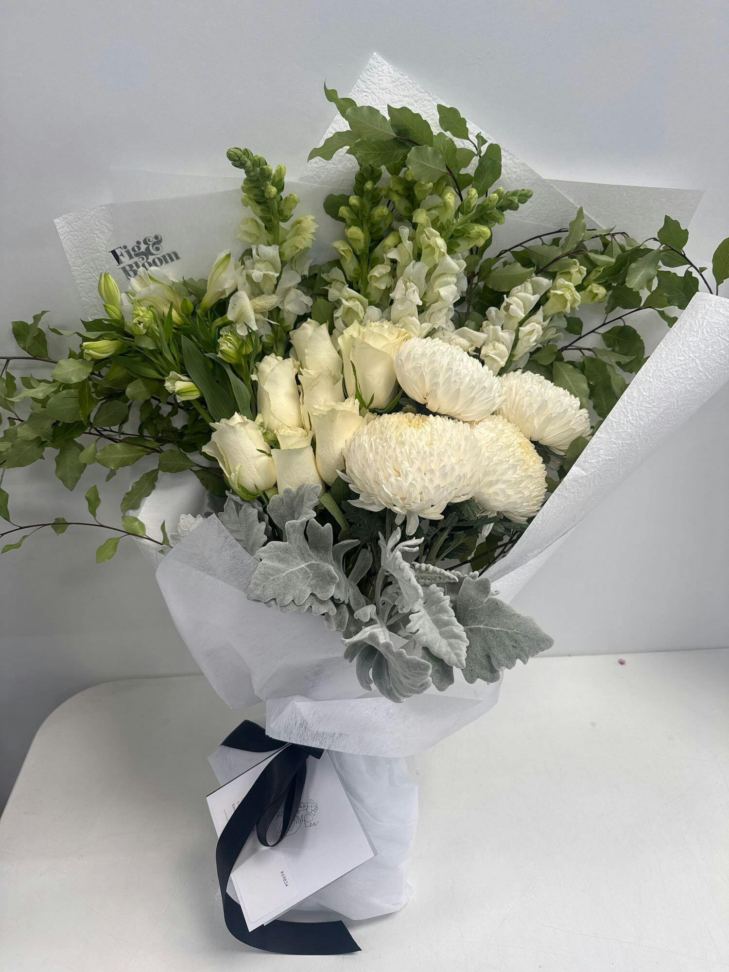 Subject to market availability this arrangement includes design includes white Roses, Chrysanthemum Disbuds, Snapdragons & Hypericum berries, all styled with Eucalyptus foliage.