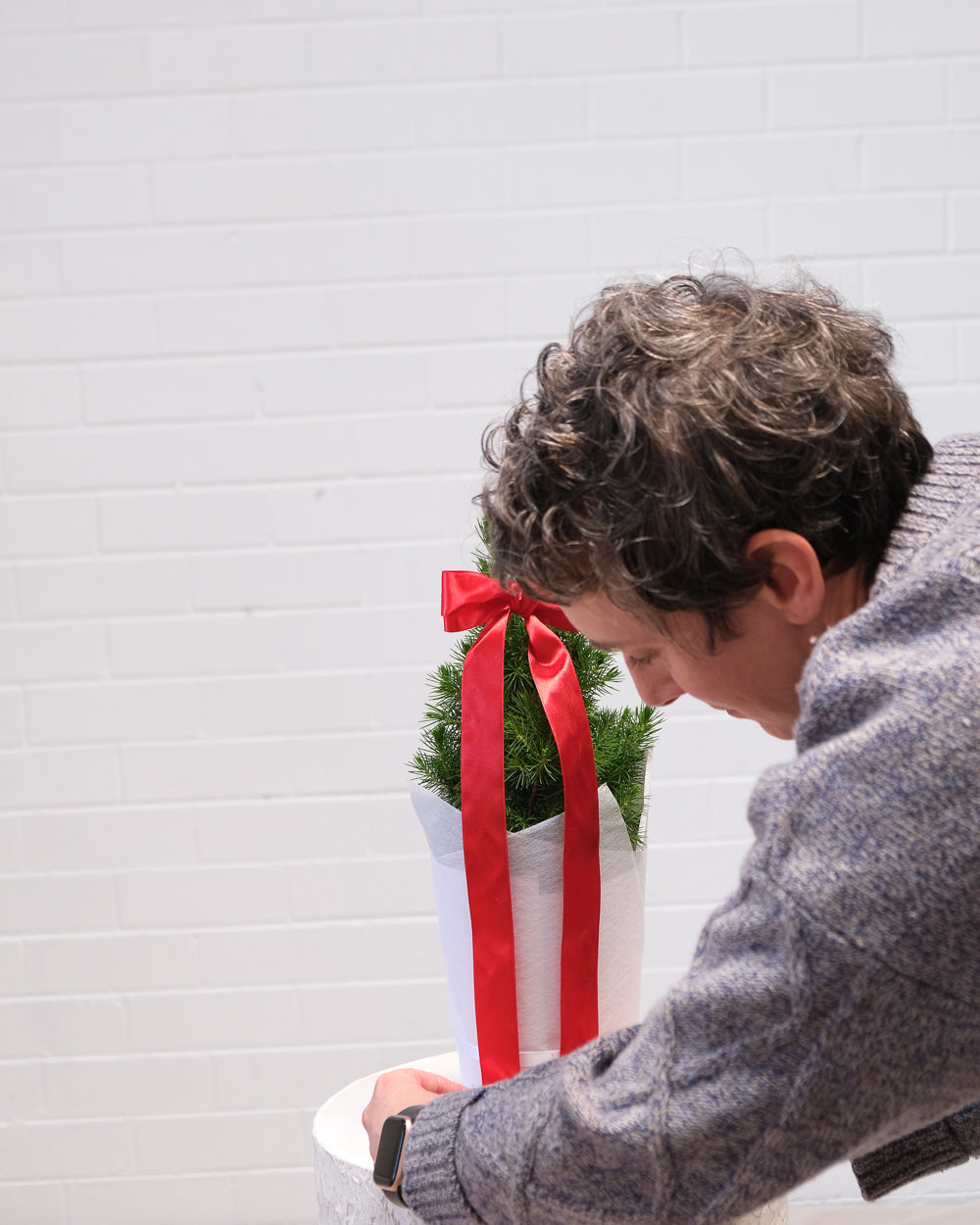 Bring a little magic home this season with our Medium Christmas Tree (65-70cm) — a charming, living pine wrapped in crisp white paper and finished with a long, festive red satin bow.