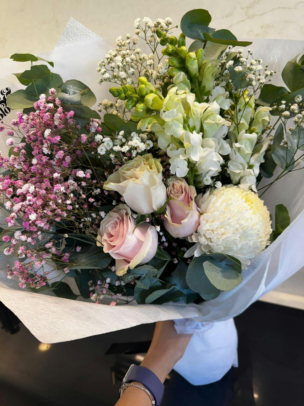 Osaka features soft pink colours paired with delicate white puffs. Subject to seasonal and market availability this design includes Roses, Chrysanthemum Disbuds and Gypsophilia.