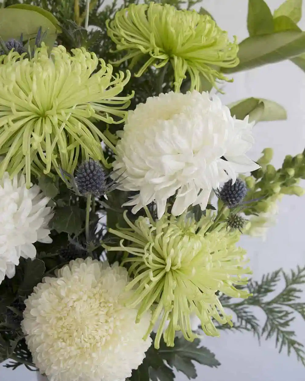 Classic and contemporary, our Savoie design combines pale green and crisp white blooms with bold pops of indigo courtesy of the unique Sea Holly blooms.