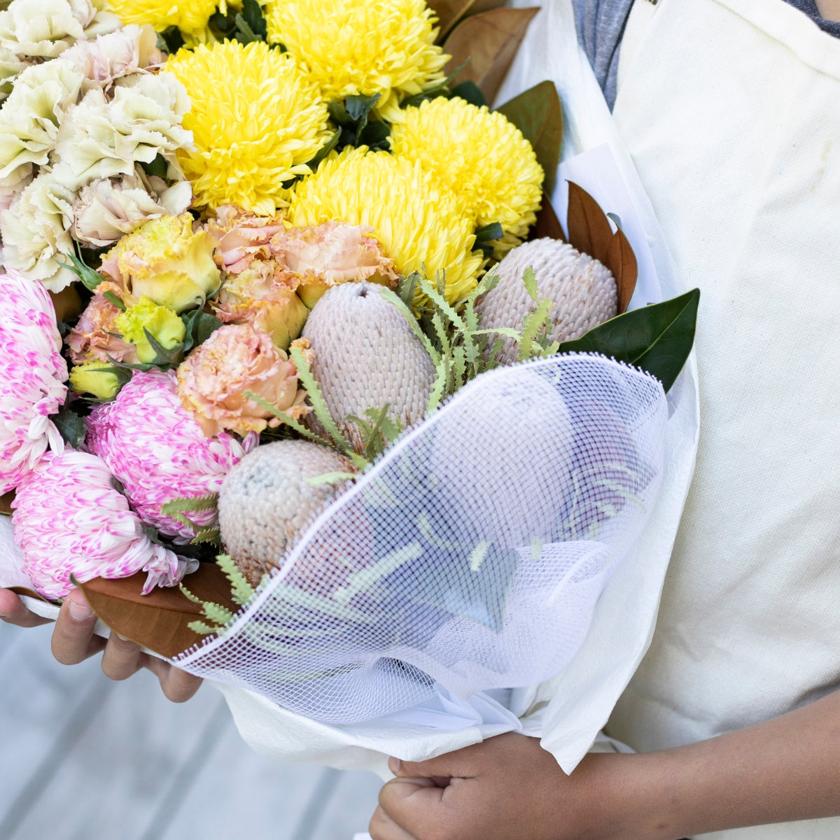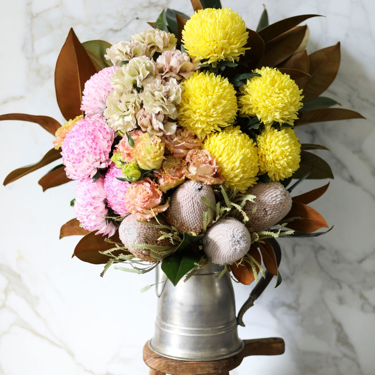 Subject to seasonal and market availability this design includes Magnolia foliage, Pin Cushion or Banskia, Lisianthus, Carnations, Yellow Pom Pom Disbuds and Local Chrysanthemum.